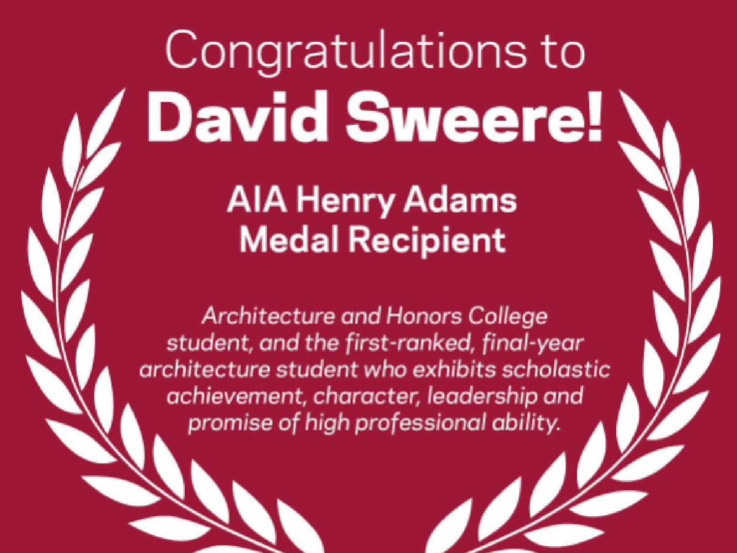 We’d like to recognize architecture and Honors College student David Sweere, who received the 2020 AIA Henry Adams Medal. This medal is awarded to the first-ranked, final-year architecture student who has shown scholastic achievement, character, leadership and promise of high professional ability. Congrats! #UARK . . .